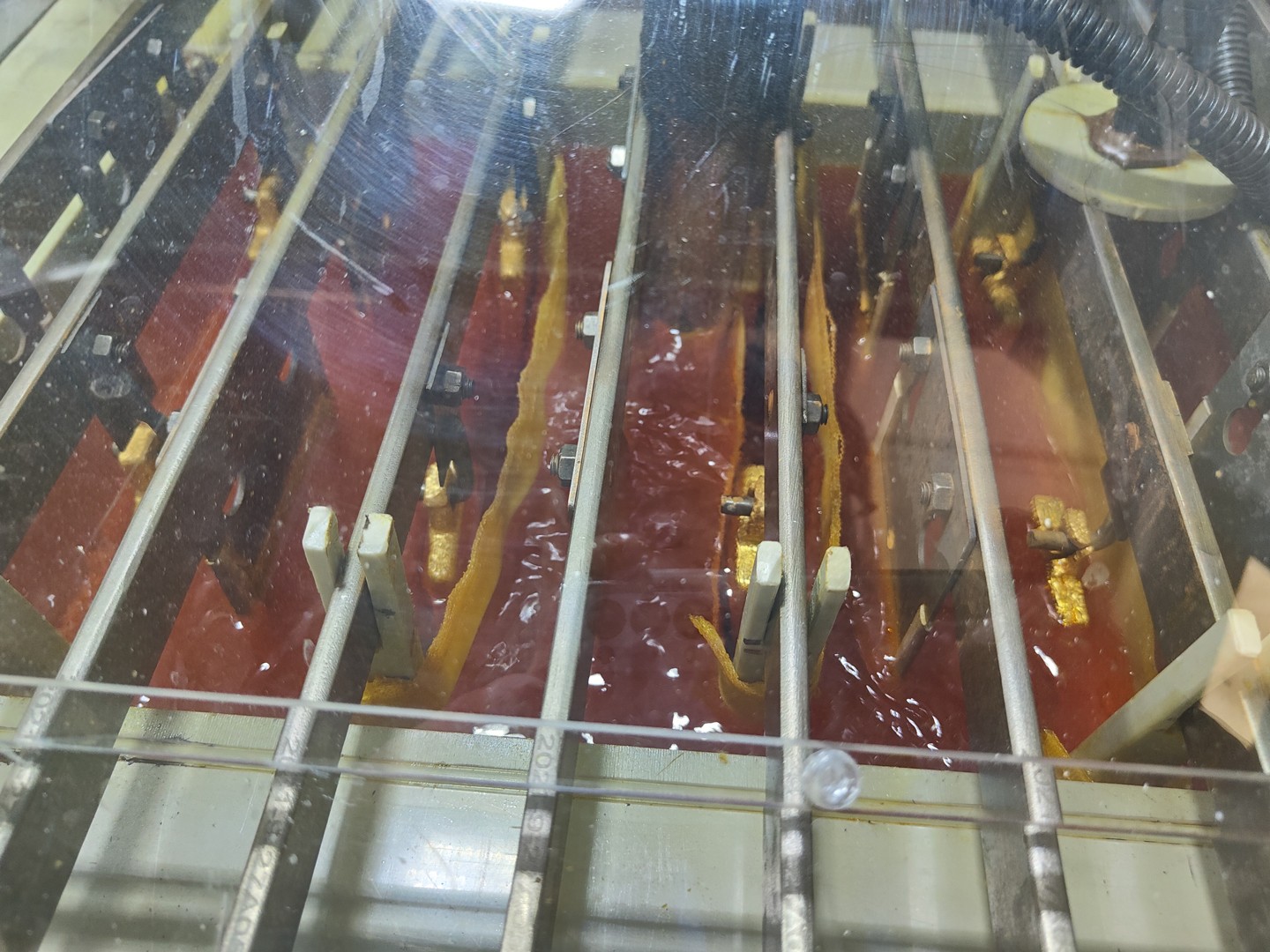 該工藝具有過程穩(wěn)定,易于控制,污染小,勞動強(qiáng)度小等優(yōu)點,但是存在生產(chǎn)周期長(時間是化學(xué)法精煉的2-3倍),電解液金占壓大(10kg/d金電解,電解液中共計占壓黃金4kg左右)